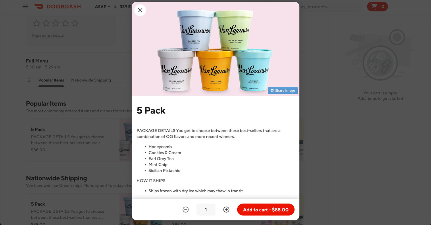 However, in shipping with DoorDash and Goldbelly, frozen goods—such as ice cream or frozen dumplings—are offered for delivery, all the while staying mindful of dry ice’s sublimation rate. However, it looks like Uber is playing it safe in only opting in for items that do not require staying frozen upon arrival.